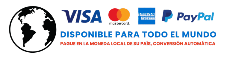 Tarjetas de crédito/débito, PayPal y métodos locales (según tu país) a través de un checkout seguro. La moneda se muestra automáticamente en el pago.